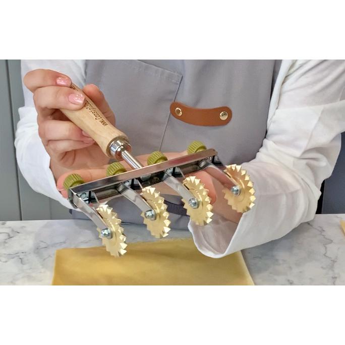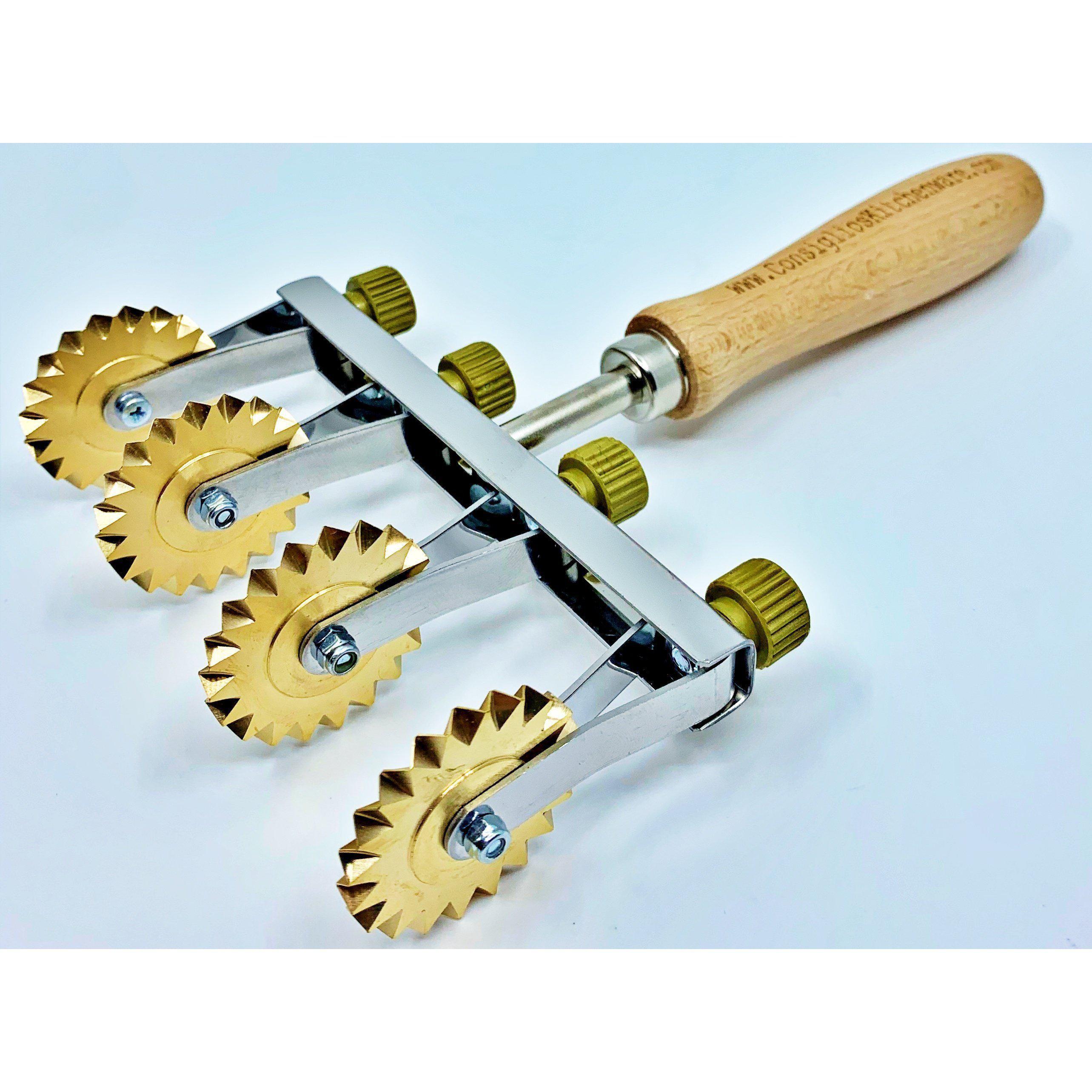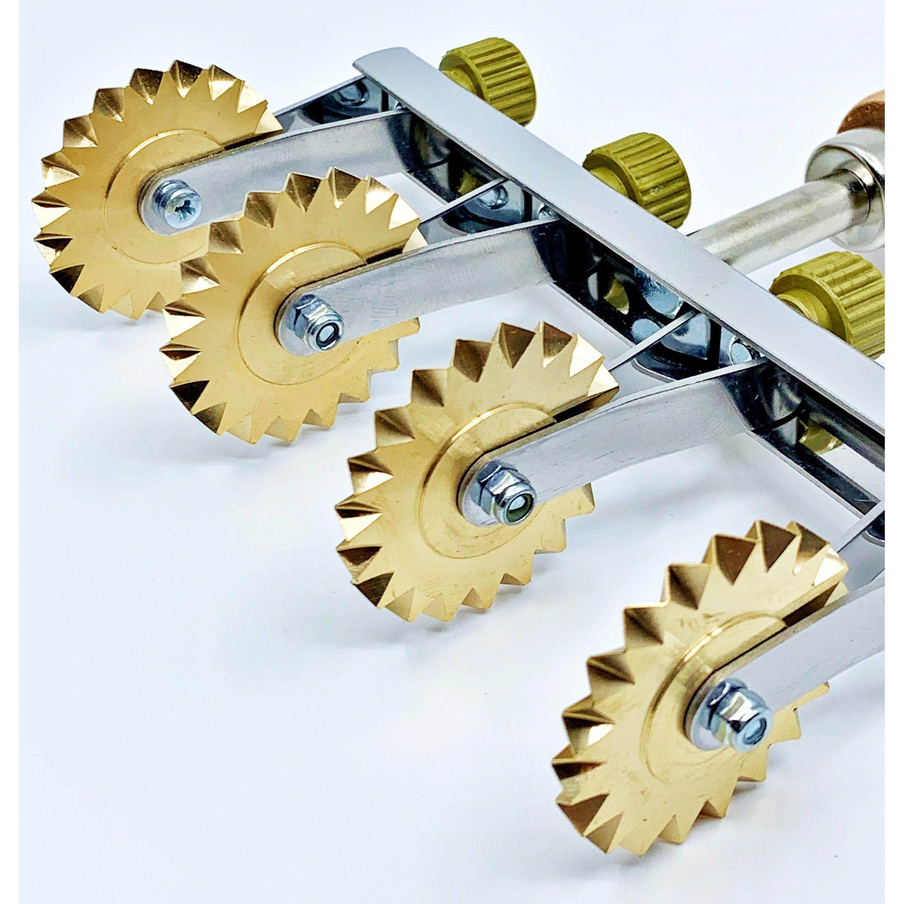 The adjustable Brass fluted pastry and pasta cutter with 4 wheels are made in Italy. Featuring 4 heavy-duty brass fluted cutting wheels with a robust natural wooden handle for ultimate comfort and quality results. These brass fluted pastry and pasta wheels are ideal for food enthusiasts and professional cooks alike.