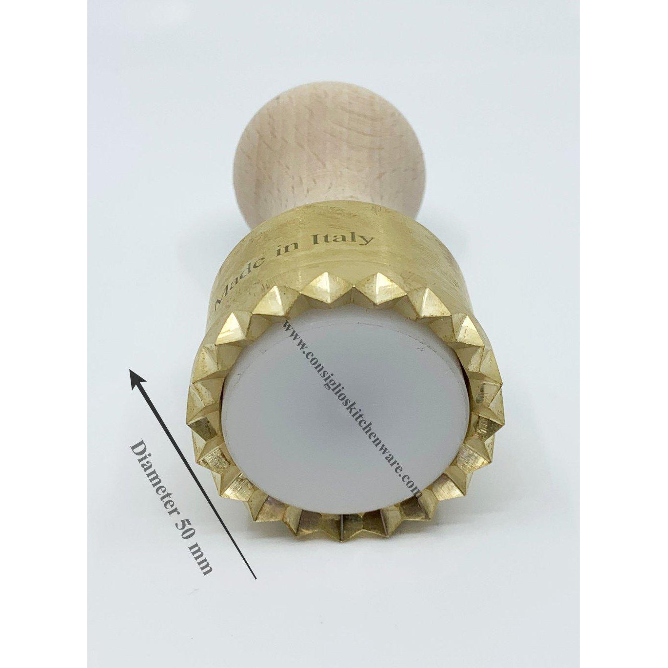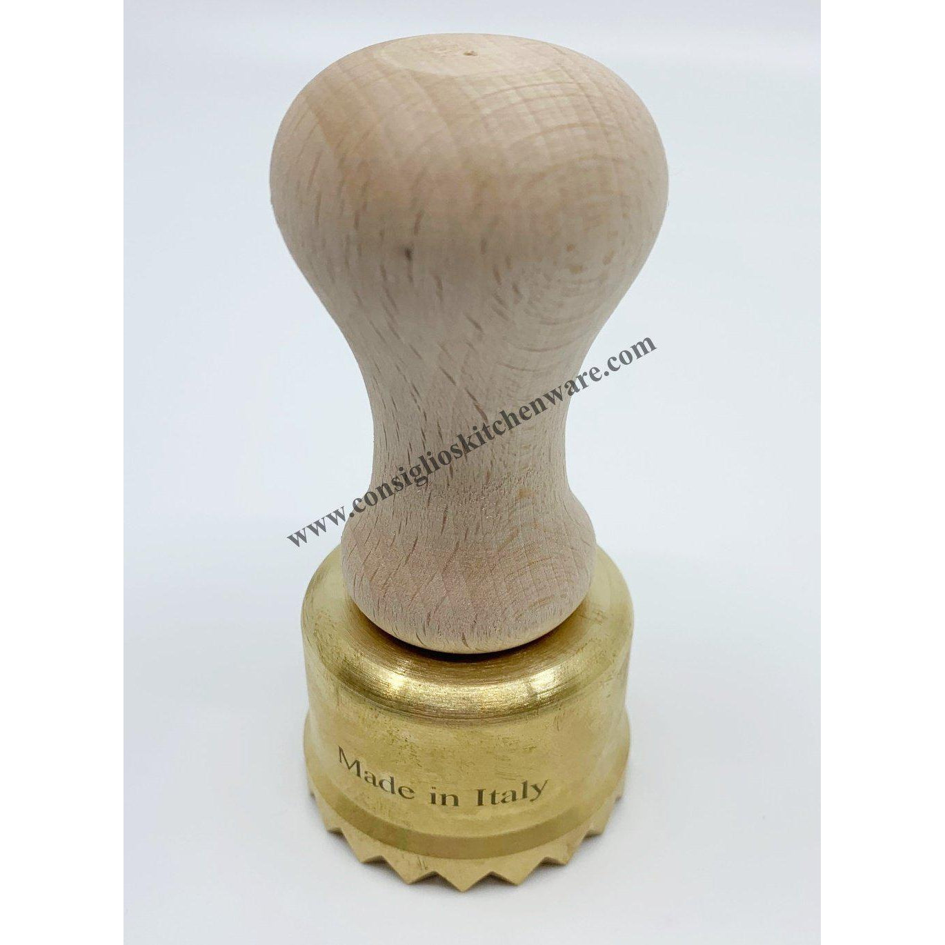 The Brass Round Spring Loaded Ravioli Stamp is made in Italy. Featuring a heavy-duty brass cutting stamp with a robust natural wooden handle for ultimate comfort and quality results. This Brass Ravioli Stamp is ideal for food enthusiasts, professional chefs, and cooks alike.
