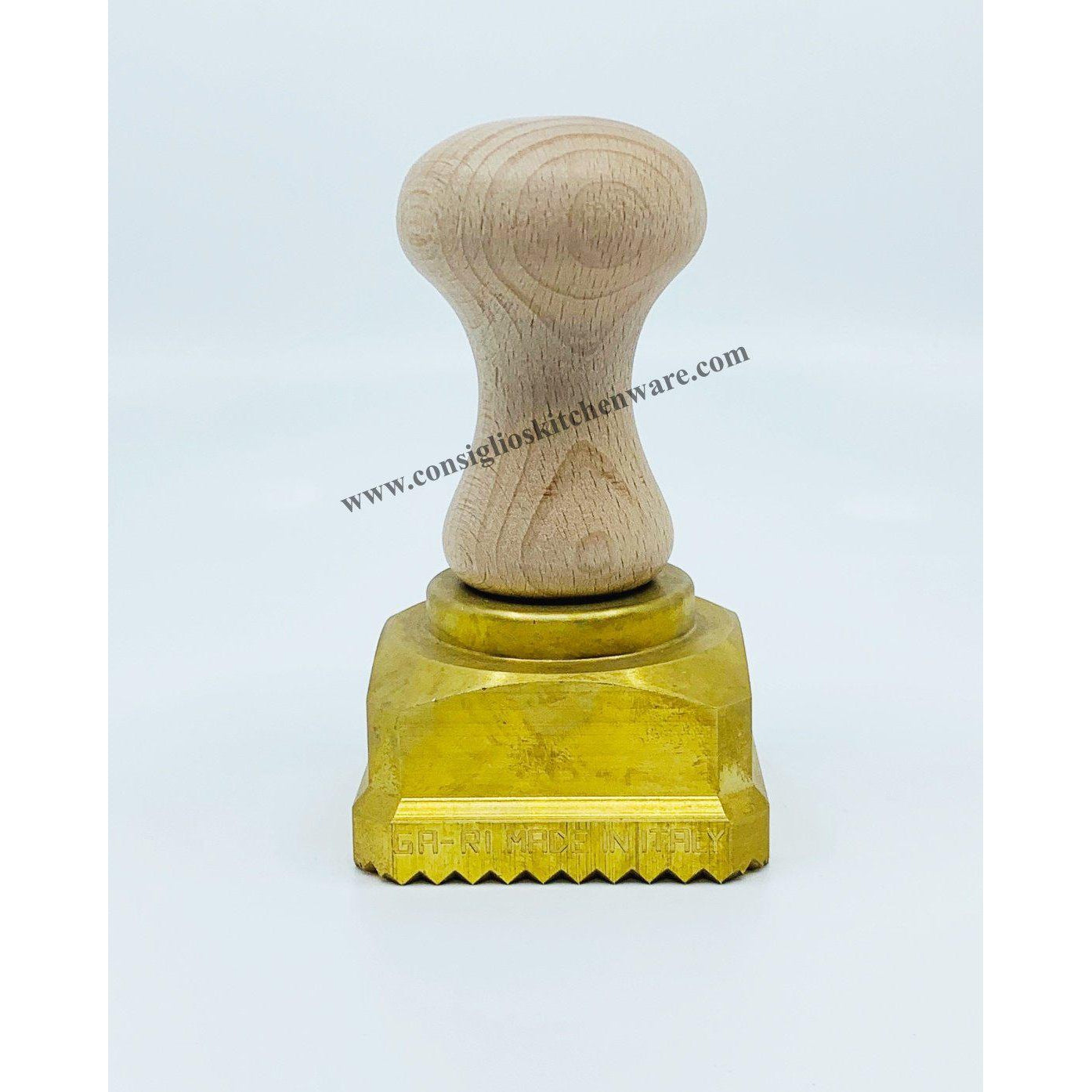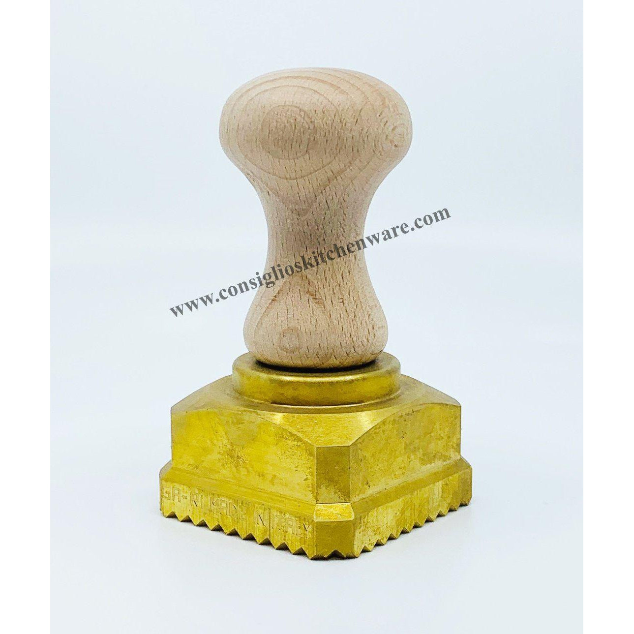 The Brass Square Spring Loaded Ravioli Stamp is made in Italy. Featuring a heavy-duty brass cutting stamp with a robust natural wooden handle for ultimate comfort and quality results. This Brass Ravioli Stamp is ideal for food enthusiasts and professional cooks alike.