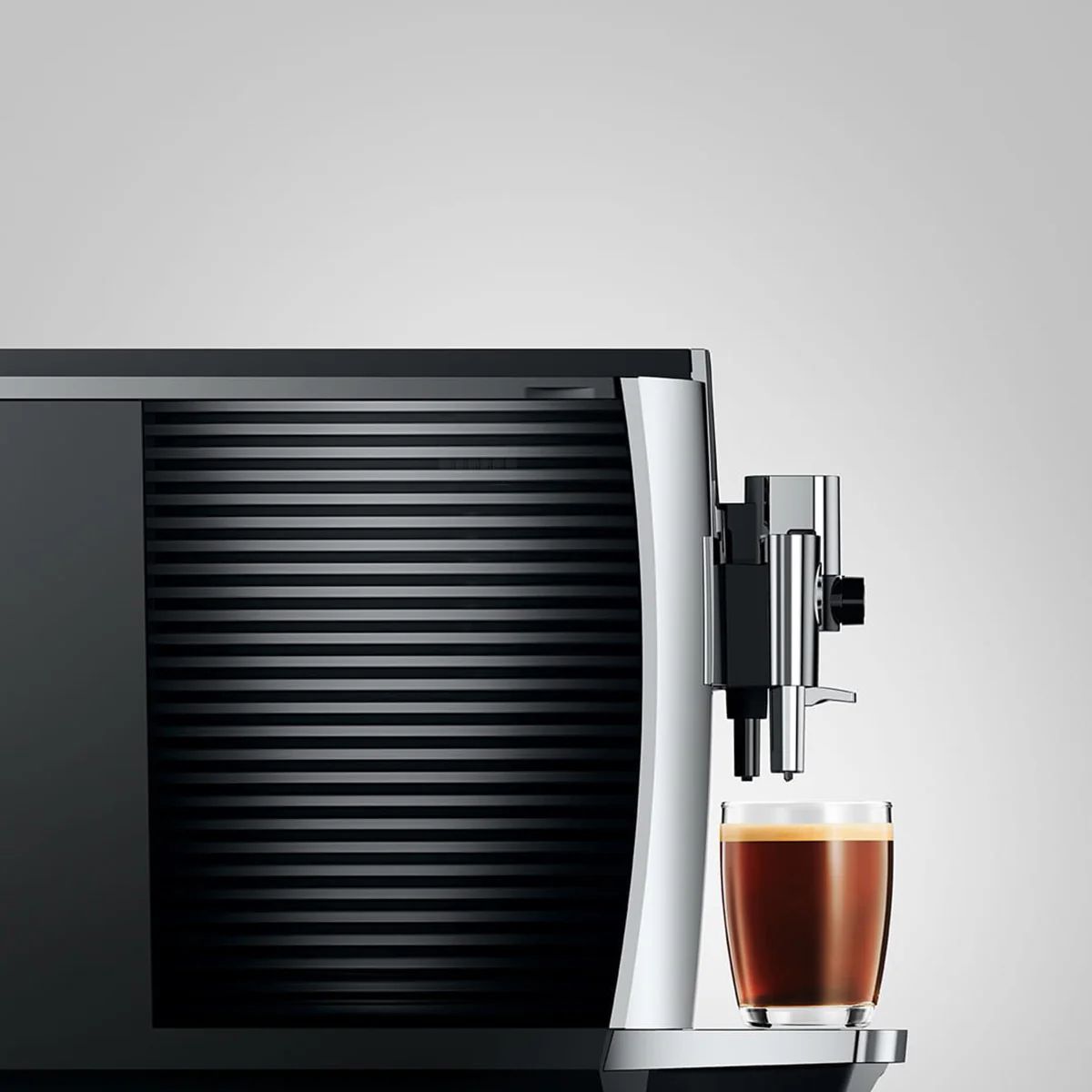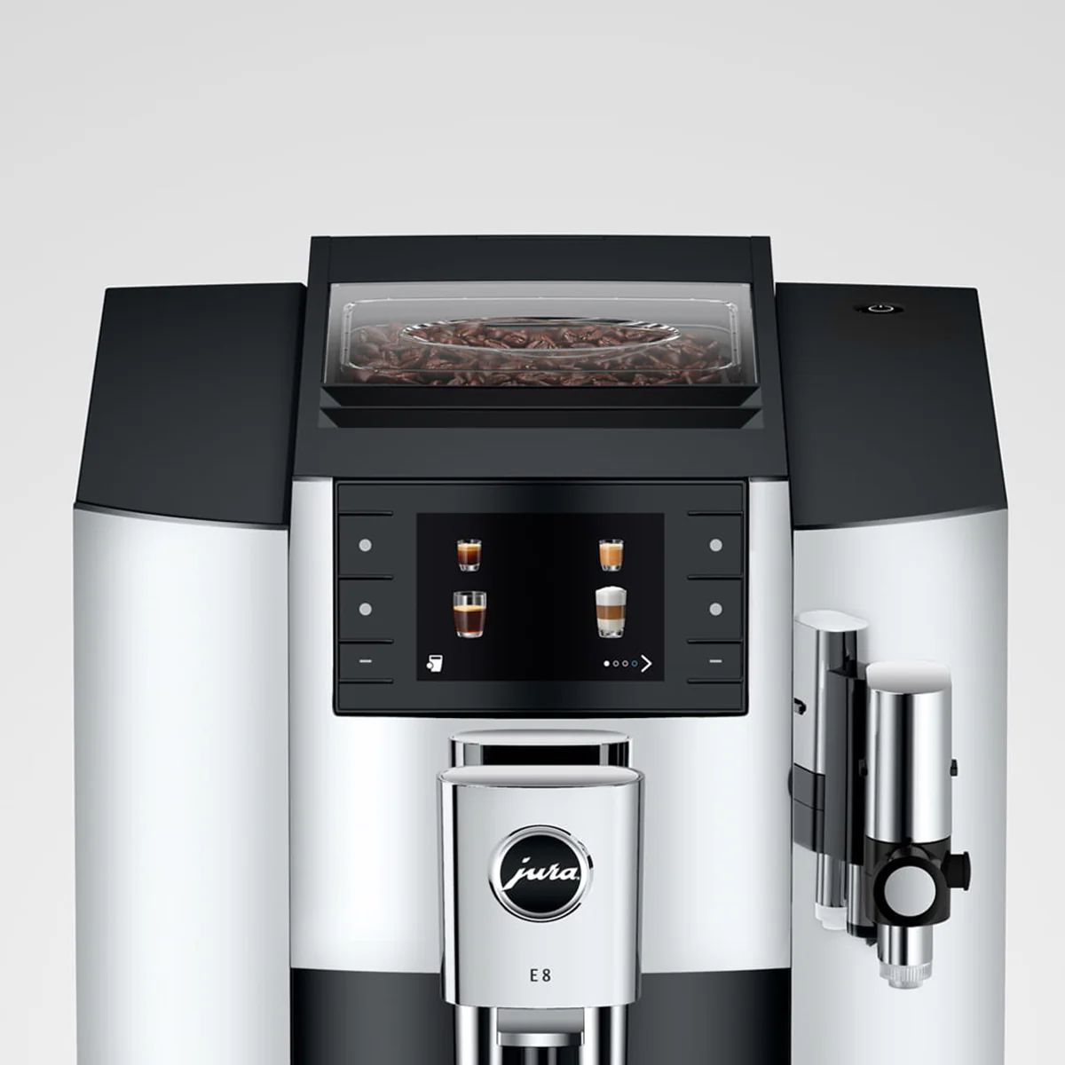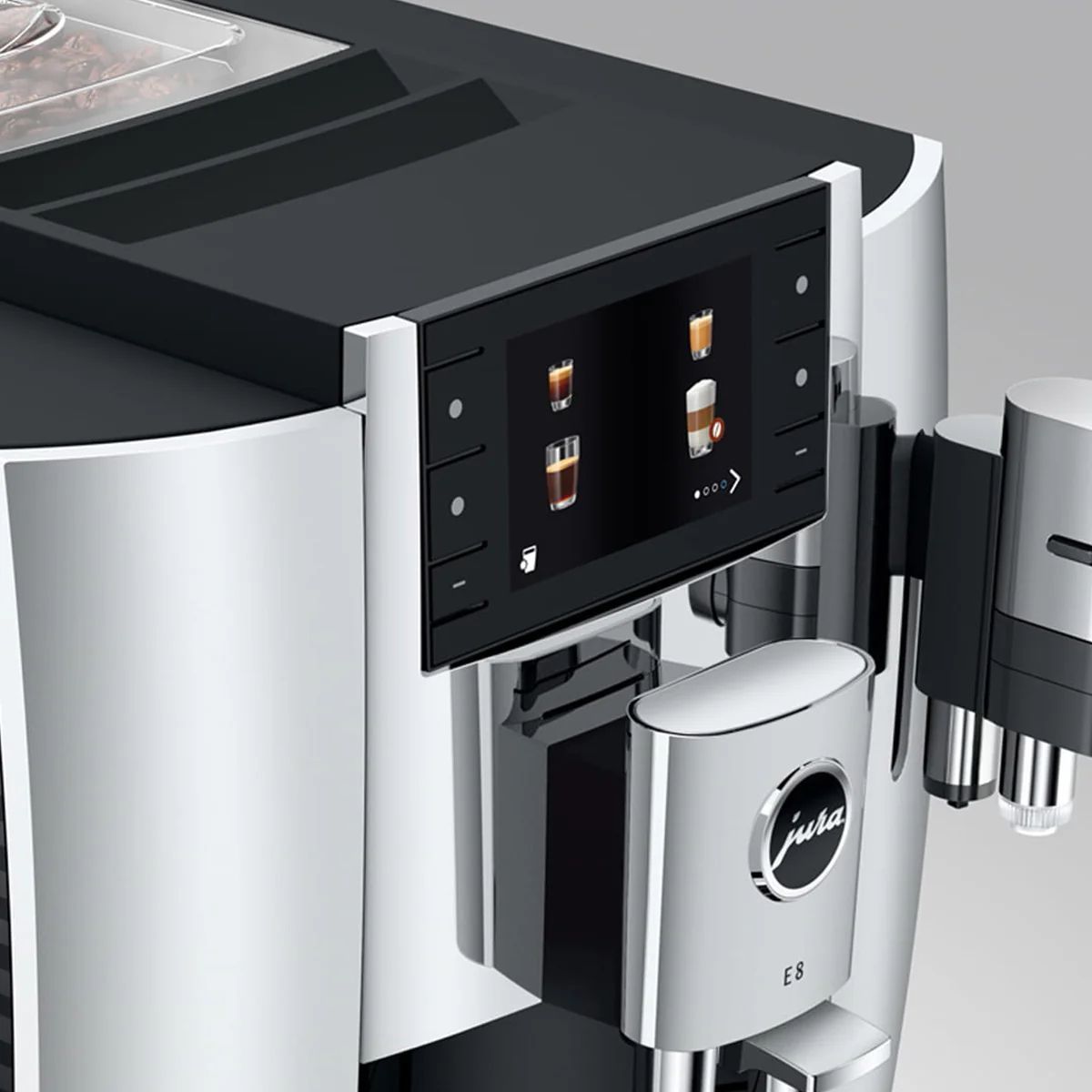 The Jura E8 Chrome offers a One-Touch Cappuccino function for trend specialties such as latte macchiato, flat white, and cappuccino or the Pulse Extraction Process (P.E.P.®) that optimizes the extraction time and guarantees the very best aroma for short specialty coffees. The 17 beverage options include espresso, 2 x espresso, coffee, 2 x coffee, americano, lungo, espresso doppio, cortado, macchiato, cappuccino, cappuccino extra shot, flat white, flat white extra shot, latte macchiato, latte macchiato extra shot, a portion of milk foam, and hot water.
