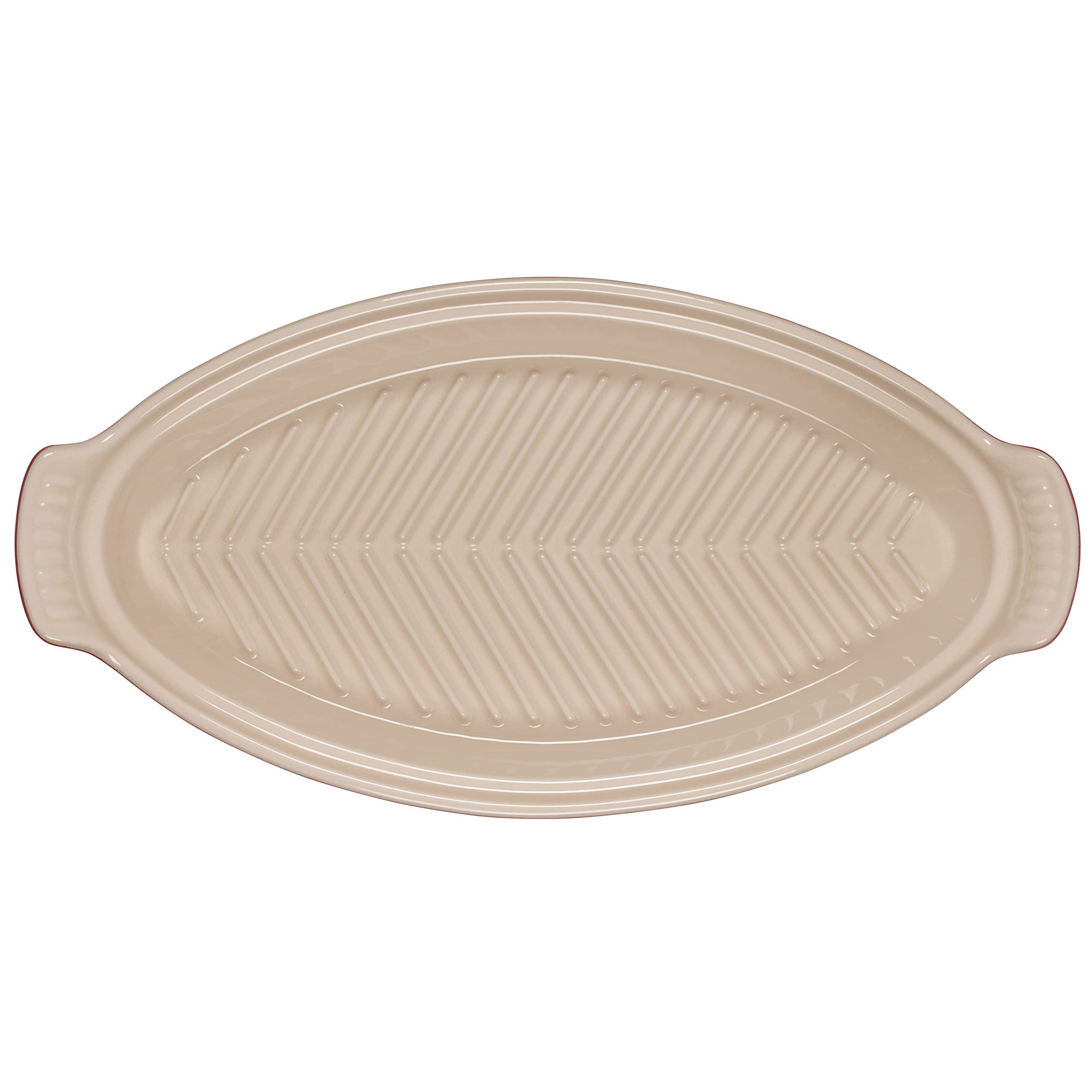 Introducing the newest addition to the Le Creuset Heritage Stoneware family, the Fish Baker 1.6L in cerise. A lovely addition to your kitchen repertoire embossed with an elegant fish motif and brushed gold knob. A striking culinary presentation from oven to tabletop for an array of fish recipes. The interior base has grooves to keep the food elevated for even cooking and browning, while the heritage Le Creuset stoneware locks in the moisture for optimal tender and moist results. Le Creuset Heritage stoneware is oven-safe, do not use it on direct heat.