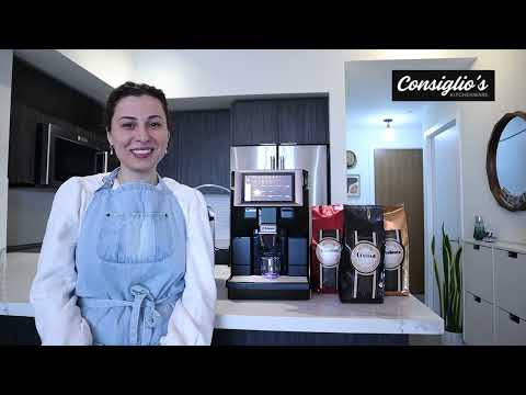 One-touch cappuccino, 7" touch screen, dual boiler, dual pump, small office/organization useable, password secured if desired, wide range of beverage options, large 2.5 L water tank, 600 gram bean hopper and 30 puck waste container.