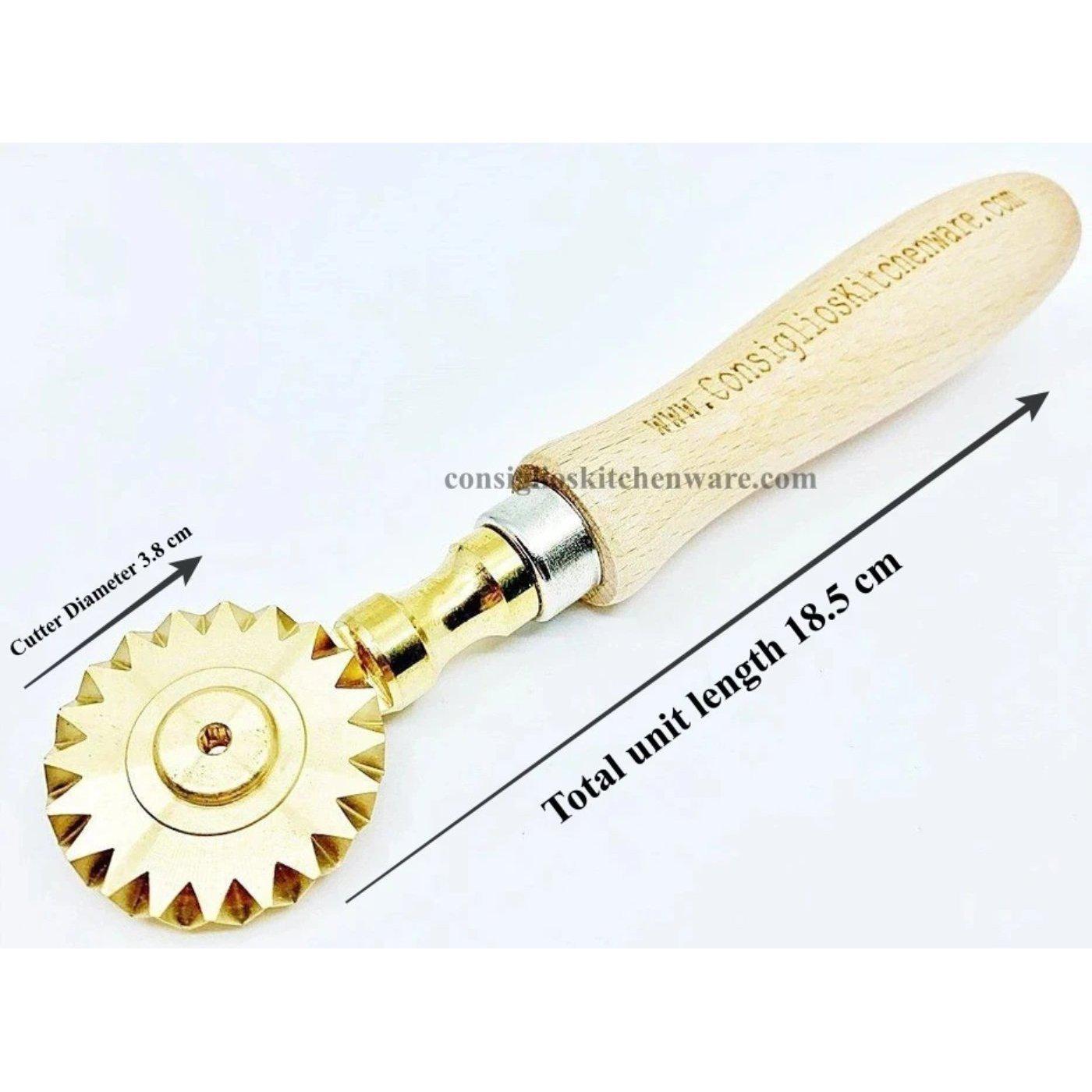 The Brass fluted pastry and pasta wheel are made in Italy. Featuring a heavy-duty brass cutting wheel with a robust natural wooden handle for ultimate comfort and quality results. This brass fluted pastry and pasta wheel is ideal for food enthusiasts and professional cooks alike.
