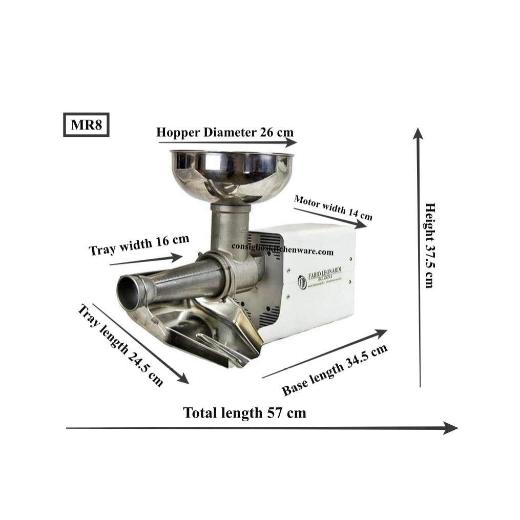 Fabio Leonardi's MR8 is ideal for home or light professional use. This motor comes with the SP3 tomato milling attachment. This model offers a 1/2 HP 350 W motor. Fabio Leonardo differentiates it's models by motor power and size of front attachment.