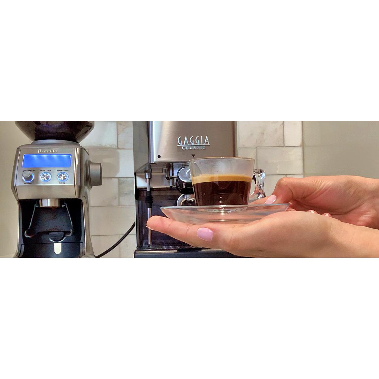 Included with this model are all the standard accessories you would expect, tamper, single and double baskets, and a pressurized double shot basket with two-way pins. Within minutes of unboxing the Gaggia Classic Pro E24, you are ready to brew fantastic commercial-quality espresso and cappuccino. While all Gaggia semi-auto machines can use pre-ground we recommend using freshly ground espresso from a quality burr grinder to achieve commercial-quality shots. The Gaggia Classic Pro E24 is fantastic for beginners or intermediates, and anyone looking to brew restaurant-quality beverages at home.