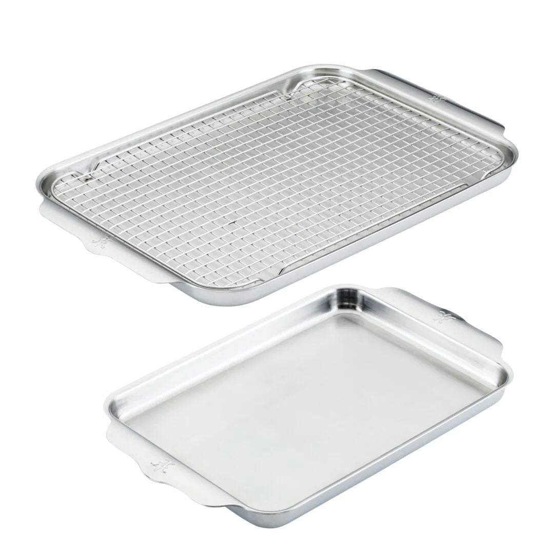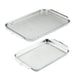 - 18" x 13" half sheet pan with cooling rack and 9" x 12.5" quarter sheet pan
