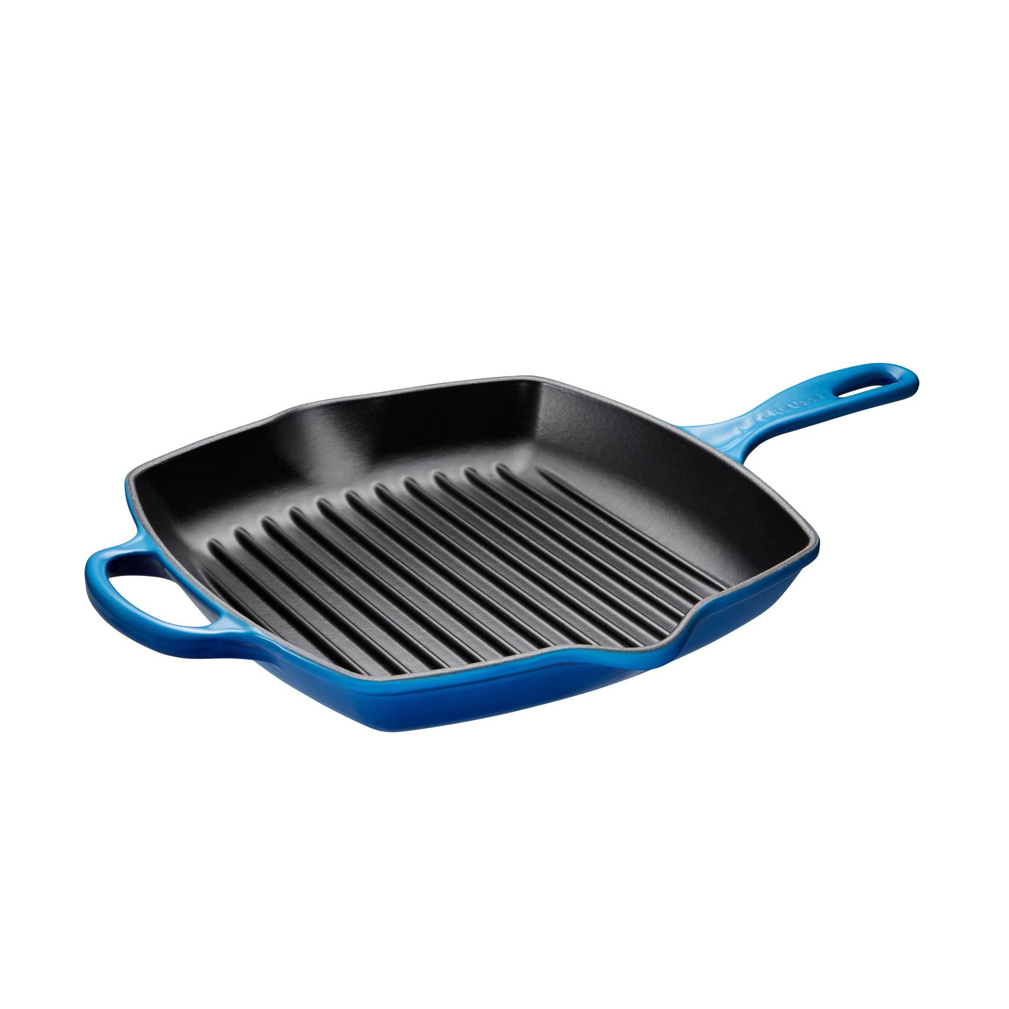 Le Creuset Square Skillet Grill pans are crafted from Le Creuset’s signature premium quality enameled cast iron. Featuring a raised ribbed interior surface, the Le Creuset Square Skillet Grill is perfect for searing, simmering or frying, while also draining excess fats and grease away. Le Creuset Skillets feature matte black interior enamel, providing the even heating and retention benefits of cast iron without the need to season.   Features: Dual spout design allows for easy, drip free pouring 26 cm/ 10" 1.8L / 2 Q Induction compatible Ideal for all heat sources, including: ceramic stovetops, induction, electric, gas, radiant ring, ovens Dishwasher safe Vibrant, chip-resistant enamel  Made in France  Lifetime Warranty