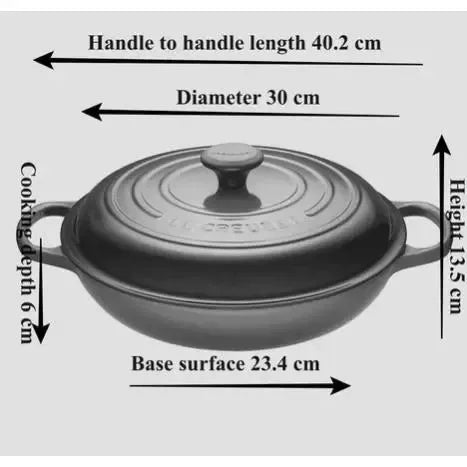 Le Creuset Shallow Braisers are ideal for all your cooking and braising needs. The shallow round shape makes them perfect for oven or stovetop use. The heavy lids allow for the moisture to remain inside the pot resulting in delicious tender restaurant-quality meals. You can use this for all your roasting, braising, frying, and basting. The unique shape of this cookware makes them a chef's favorite. Easy to use and clean your Le Creuset braiser and will quickly become a favorite in your own kitchen. A soft bottom base keeps your stovetop safe from scratches or marks.