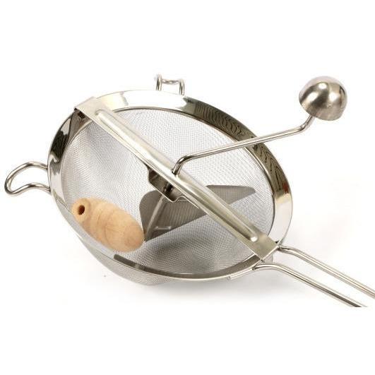 The OMAC 100% Made in Italy Passacollino stainless steel and wire mesh sieve. This product is designed to sieve a variety of fruits or vegetables into extra fine puree using a wire mesh and rotary wooden wheele.