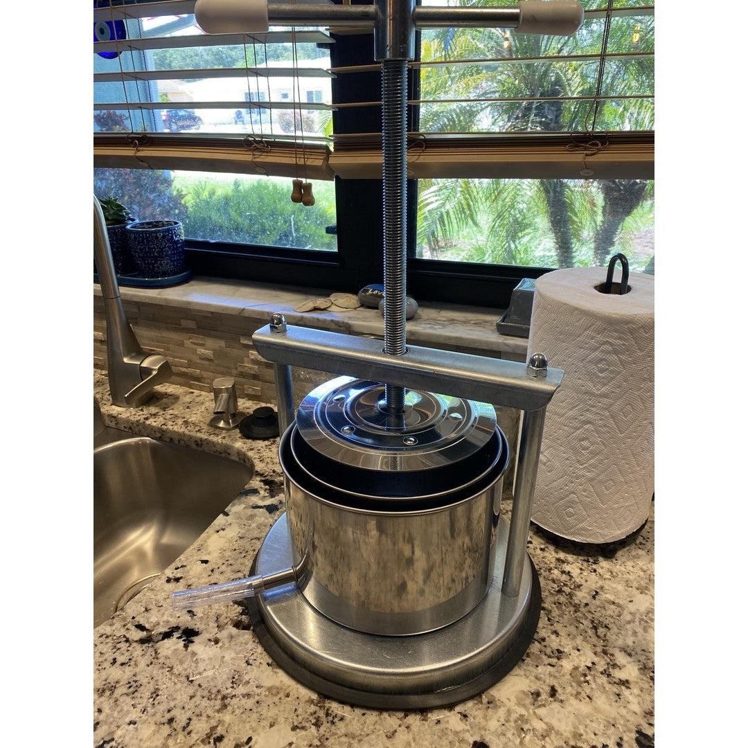 The Vegetable Fruit Press is known as a Torchietto in Italy. Torchiettos are a tool commonly used for pressing soft foods like eggplants (jardiniere), vegetables, nut milk (preblended), pressing cheese, and juicing fruits, and vegetables. Fruits with pits and hard objects are not recommended. Torchiettos specialize in removing liquids from solids, these units boast a solid threaded shaft & bolted heavy-duty posts to support the crank wheel. A solid steel basket holds a perforated basket, and liquid drains thru the drainpipe fitted with a rubber spout for easy draining.The torchietto have a galvanized treatment resulting in a  protective coating on the steel. This results in long-lasting, low maintenance, robust build, and professional results.  Simply put your vegetables/fruits into the perforated basket and use the solid turning handle to compress liquids out. The dried vegetables or fruit will stay within the perforated basket and all liquid will drain into the solid steel pai...